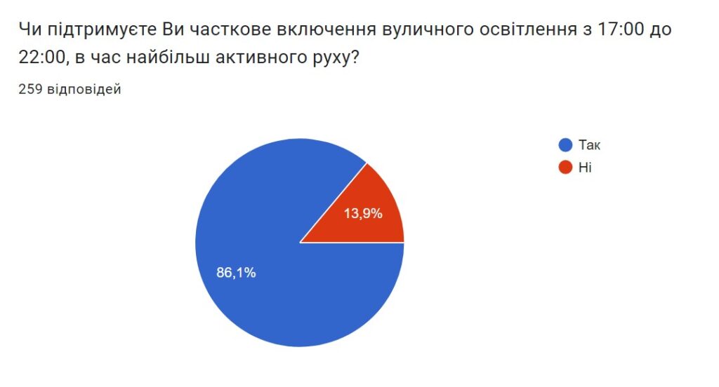 86,1% громадян, які взяли участь в опитуванні, підтримують часткове включення вуличного освітлення, а 13,9% – проти. Тому у вечірній час, принаймні на окремих ділянках, КП “Славута-Сервіс” вмикатиме зовнішні ліхтарі. Освітлення інших вулиць буде здійснюватись у міру збільшення доведених для громади потужностей споживання електроенергії.