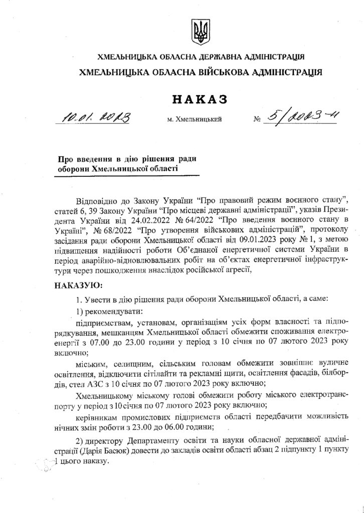 НАКАЗ НАЧАЛЬНИКА ХМЕЛЬНИЦЬКОЇ ОБЛАСНОЇ ВІЙСЬКОВОЇ АДМІНІСТРАЦІЇ СЕРГІЯ ГАМАЛІЯ Дата 12.01.202312.01.2023 Створив info-mvk