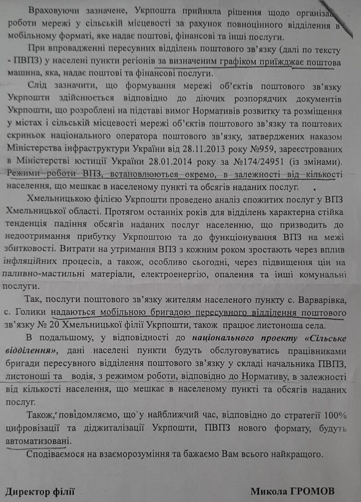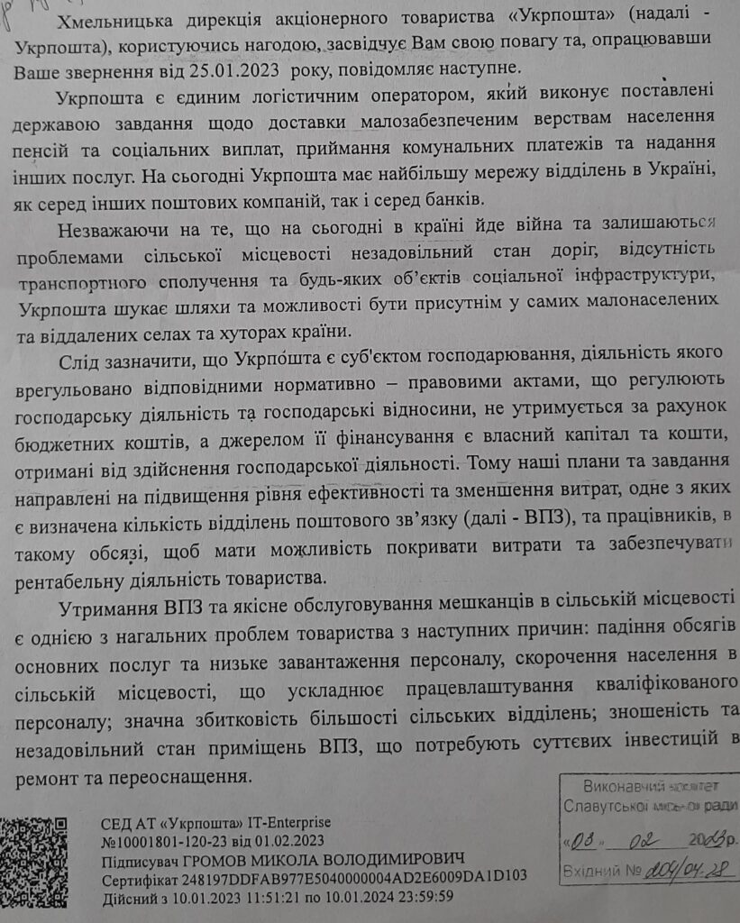 ВІДПОВІДЬ АТ “УКРПОШТА” НА ЗВЕРНЕННЯ ВИКОНАВЧОГО КОМІТЕТУ СЛАВУТСЬКОЇ МІСЬКОЇ РАДИ Дата 03.02.202309.02.2023 Створив info-mvk