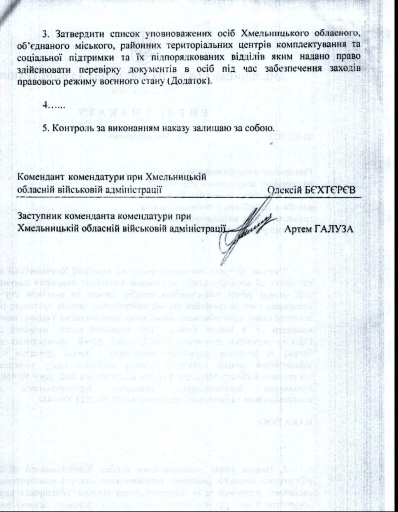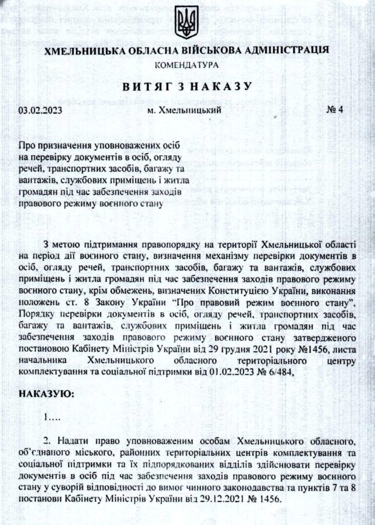 До Вашої уваги витяг з наказу комендатури Хмельницької обласної військової адміністрації.
