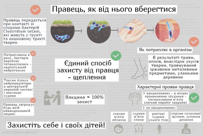 Захворювання легко попередити і важко лікувати. Сучасна медицина володіє надійними способами запобігання захворюванню на правець. Головна зброя – щеплення! Відповідно до Національного календаря профілактичні щеплення від правцю необхідно проводити дітям у віці 2, 4, 6, 18 місяців, 6 та 16 років. Дорослим поновлювати щеплення від правця необхідно кожні 10 років.