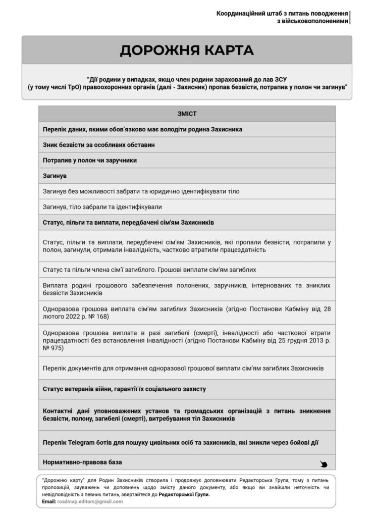 Дорожня карта дії родини у випадках, якщо член родини зарахований до лав #ЗСУ (у тому числі #ТрО), правоохоронних органів пропав безвісти, потрапив у полон чи загинув.