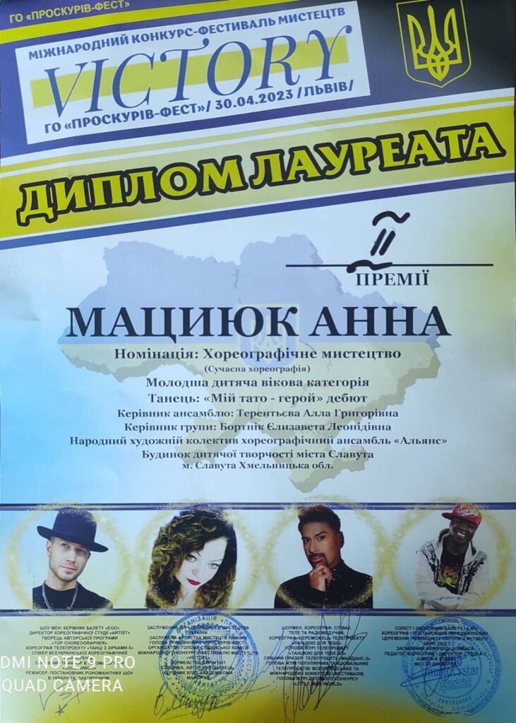🥈ІІ місце – Анна Мациюк – «Мій тато герой» – дебют у сучасній хореографії. Наша маленька зірочка – справжній боєць. Напередодні конкурсу травмувала ніжку, але не зважаючи на це, боролося як справжня танцівниця!
