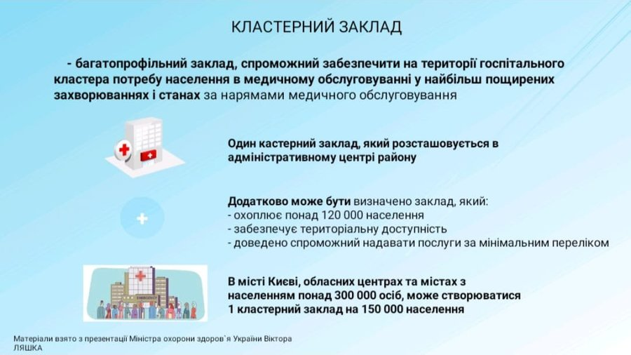 Кластерний заклад охорони здоров’я — багатопрофільний лікарняний заклад, спроможний забезпечити на території госпітального кластера потребу населення в медичній та реабілітаційній допомозі при найбільш поширених захворюваннях і станах за напрямами стаціонарної медичної допомоги відповідно до переліку, визначеного Кабінетом Міністрів України.