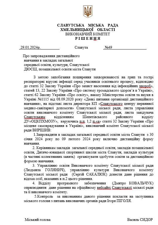 В СЛАВУТСЬКІЙ ГРОМАДІ ЗАПРОВАДЖУЄТЬСЯ ДИСТАНЦІЙНЕ НАВЧАННЯ – РІШЕННЯ ВИКОНАВЧОГО КОМІТЕТУ СЛАВУТСЬКОЇ МІСЬКОЇ РАДИ Дата 29.01.202429.01.2024 Створив info-mvk