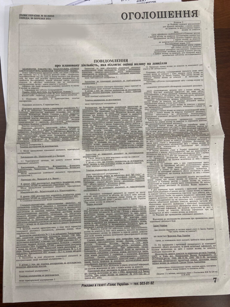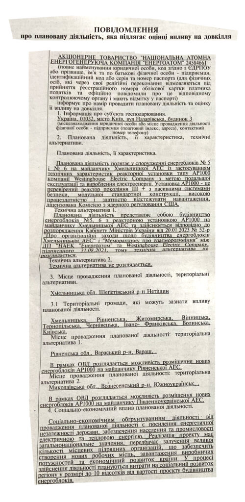 20 березня в газеті “Голос України” №55 (8334) оприлюднено Повідомлення про планову діяльність, яка підлягає оцінці впливу на довкілля акціонерного товариства “Національна атомна енергогенеруюча компанія “Енергоатом”. Планова діяльність полягає у спорудженні енергоблоків №5 і №6 на майданчику Хмельницької АЕС із застосуванням технічних характеристик реакторної установки АР1000.