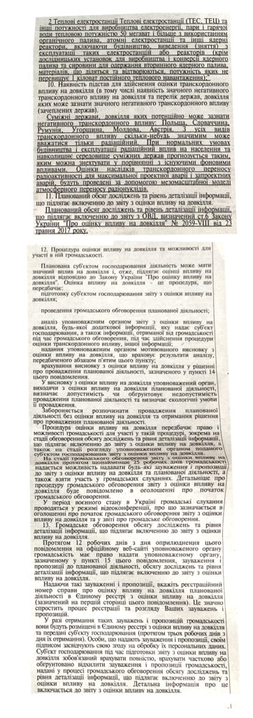 Чинним законодавством України передбачено, що громадськості надається можливість надавати свої зауваження і пропозиції до планової діяльності, яка підлягає оцінці впливу на довкілля. Також, як було повідомлено, Міністерством захисту довкілля та природних ресурсів України невдовзі з даного питання буде оголошено громадське обговорення, яке включатиме й проведення громадських слухань у режимі відеоконференції.
