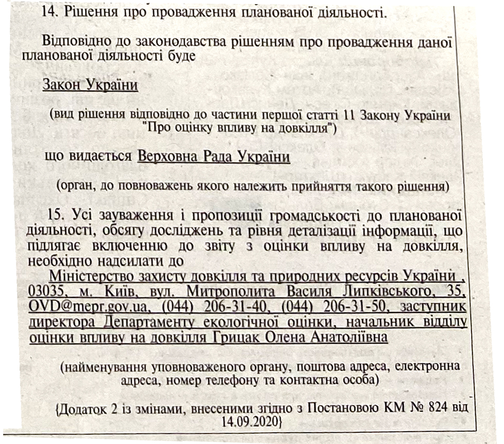 Фото копії публікації додаємо, а також знайти вказане повідомлення можна буде у Єдиному реєстрі з оцінки впливу на довкілля (https://eia.menr.gov.ua/uk/cases) за реєстраційним номером 5333.