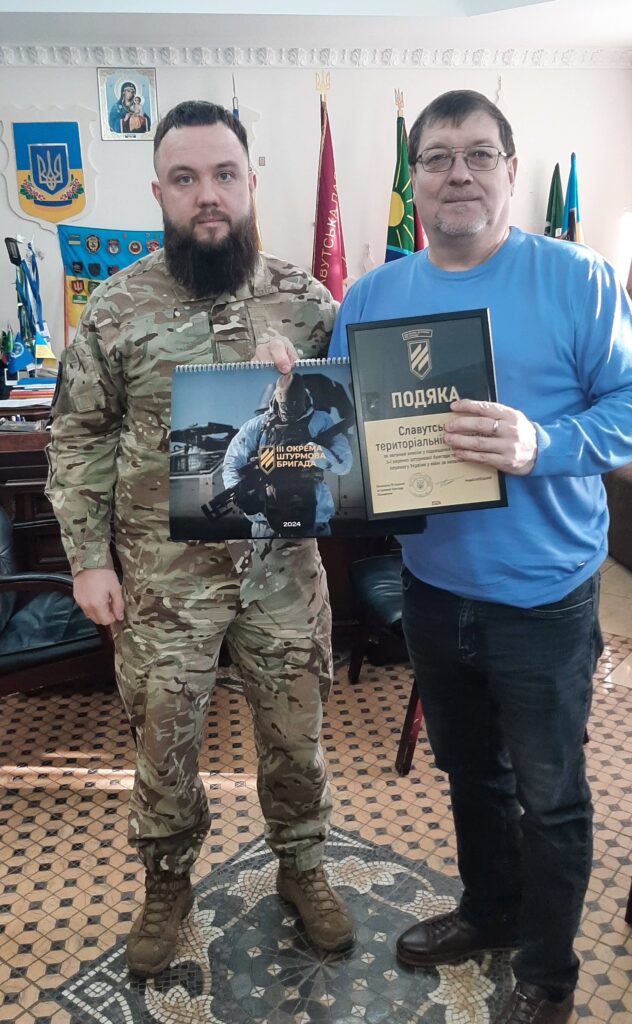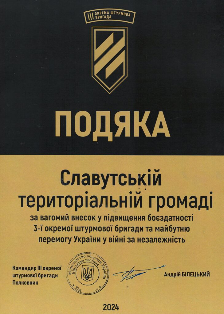 3 квітня керівник відділу ЦВС Третьої окремої штурмової бригади Вадим Кудіяров передав міському голові Василю Сидору подяку для Славутської громади за вагомий внесок у підвищення боєздатності 3-ї окремої штурмової бригади та майбутню перемогу України у війні за незалежність від командира бригади, полковника Андрія Білецького.