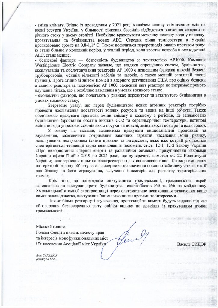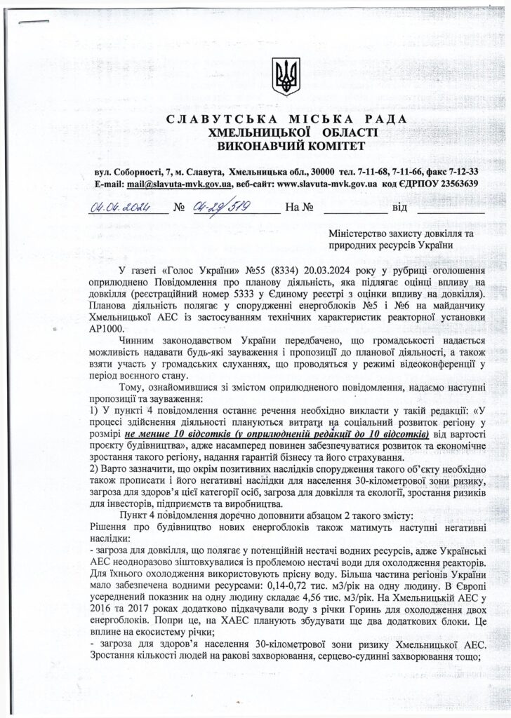 З 28 березня по 4 квітня виконавчий комітет Славутської міської ради оголосив збір пропозицій та зауважень громадян щодо даного питання. І вже сьогодні, 4 квітня, міський голова Василь Сидор направив звернення до Міністерства захисту довкілля та природних ресурсів України із першими зауваженнями та пропозиціями щодо спорудження енергоблоків №5 і №6 на Хмельницькій АЕС.