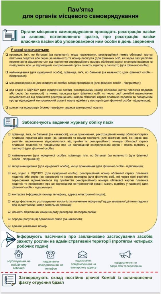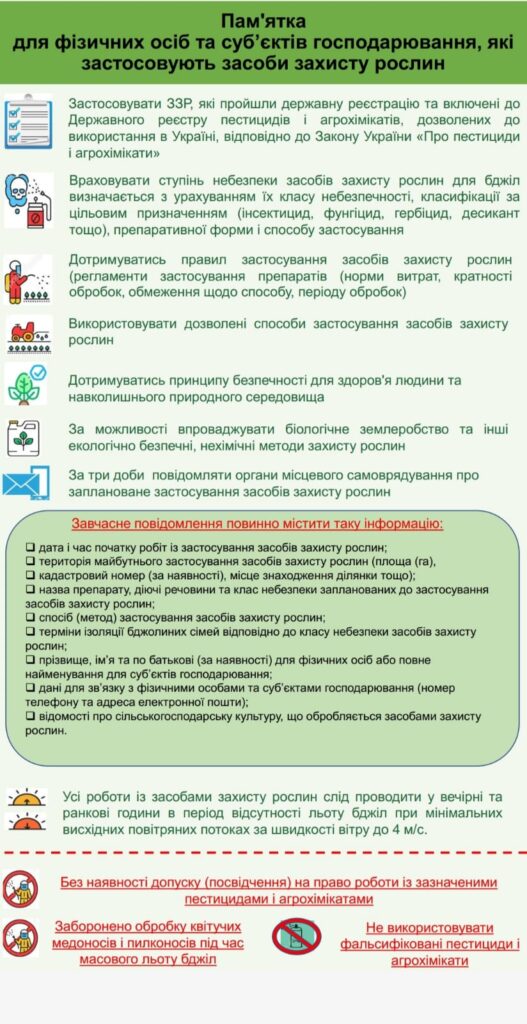 З метою попередження виникнення скарг, щодо неправомірних дій при застосуванні засобів захисту рослин на сільськогосподарських угіддях, охорони бджіл, виробництва, заготівлі та переробки безпечних продуктів бджільництва, розміщаємо наступні пам’ятки.