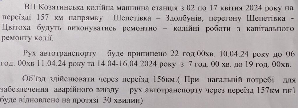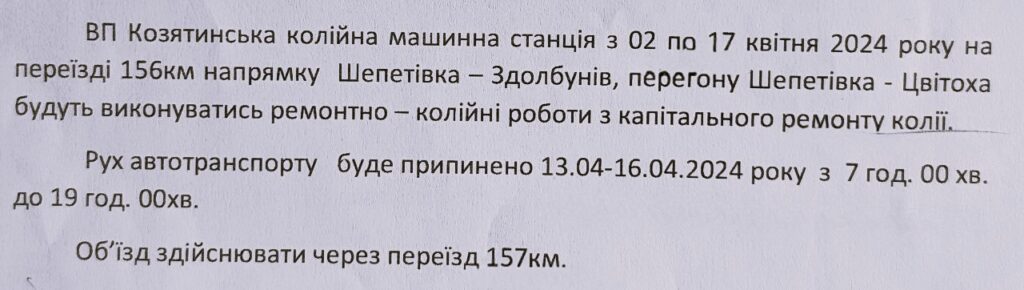 ДО ВІДОМА ВОДІЇВ ТА ІНШИХ ПРИЧЕТНИХ ОСІБ Дата 10.04.202410.04.2024 Створив info-mvk За інформацією виробничого підрозділу “Шепетівська дистанція колії”.