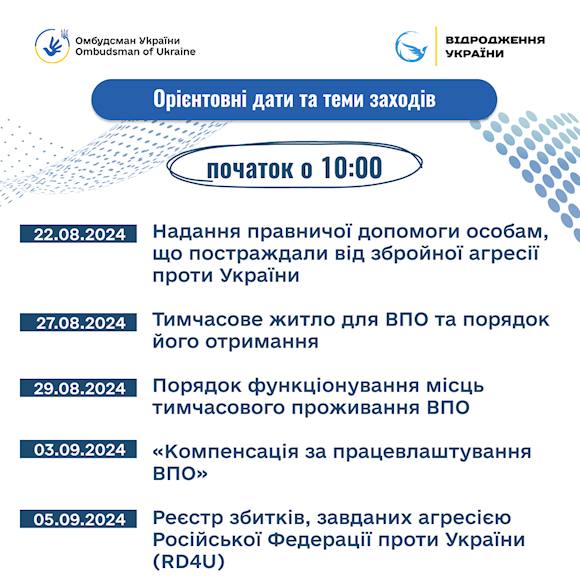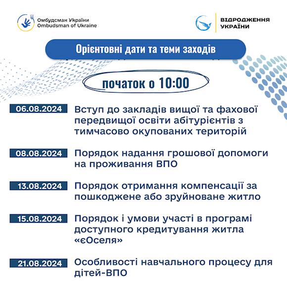 Запрошуємо ВПО на онлайн заходи, де представники різних Міністерств і Офісу Омбудсмана нададуть відповіді щодо виплати допомоги на проживання, вступу дітей до закладів освіти, постановки на квартирний облік, компенсації за пошкоджене або зруйноване майно, тощо.