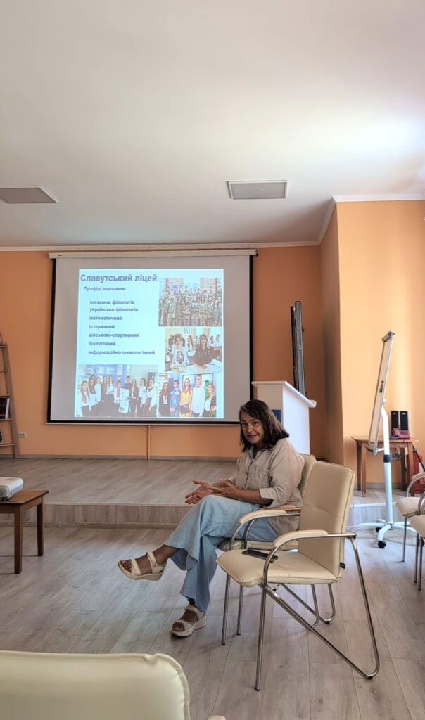 ✔️Начальник управління освіти м. Славута Ельміра Перепелиця презентувала колегам із Теофіполя освітній портрет Славутської громади, шлях створення у Славуті профільного ліцею від ідеї до втілення, зупинилася на головних викликах та проблемах освітньої галузі в умовах воєнного стану.