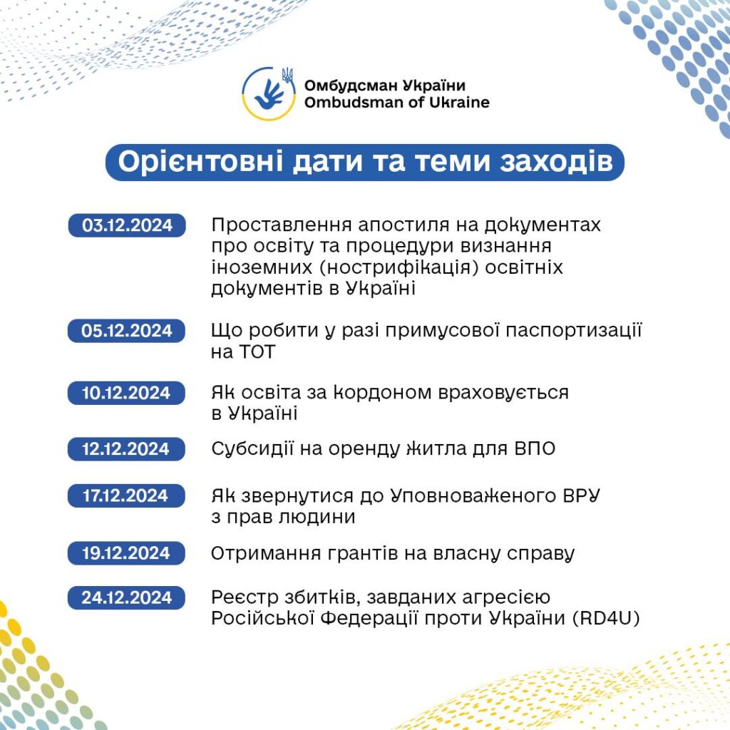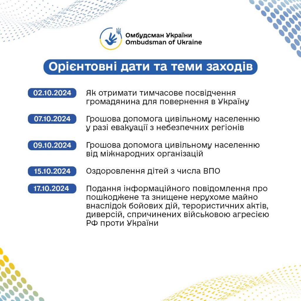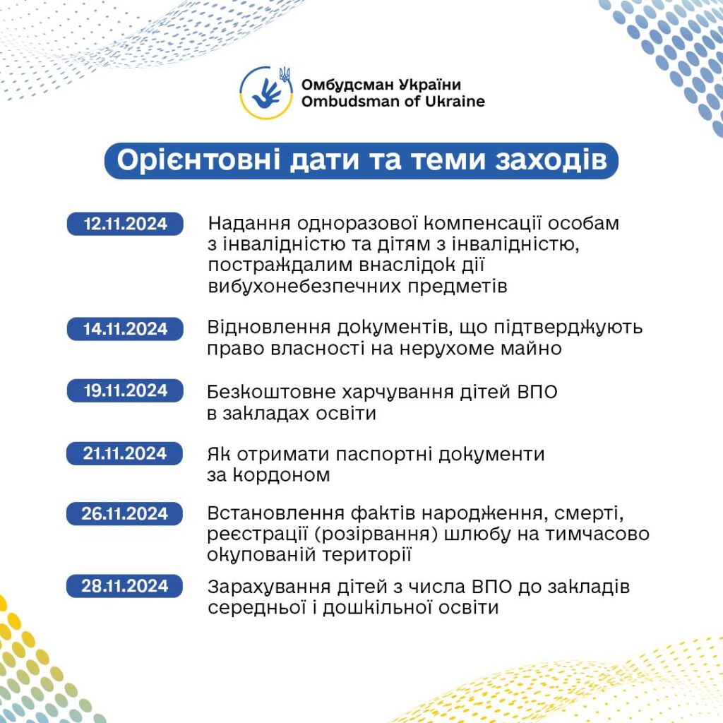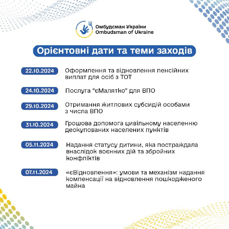 На вас чекають виступи представників міністерств та громадських організацій про практичні можливості у різних сферах. Також ви матимете змогу поставити запитання. На них відповідатимуть працівники Офісу Омбудсмана.