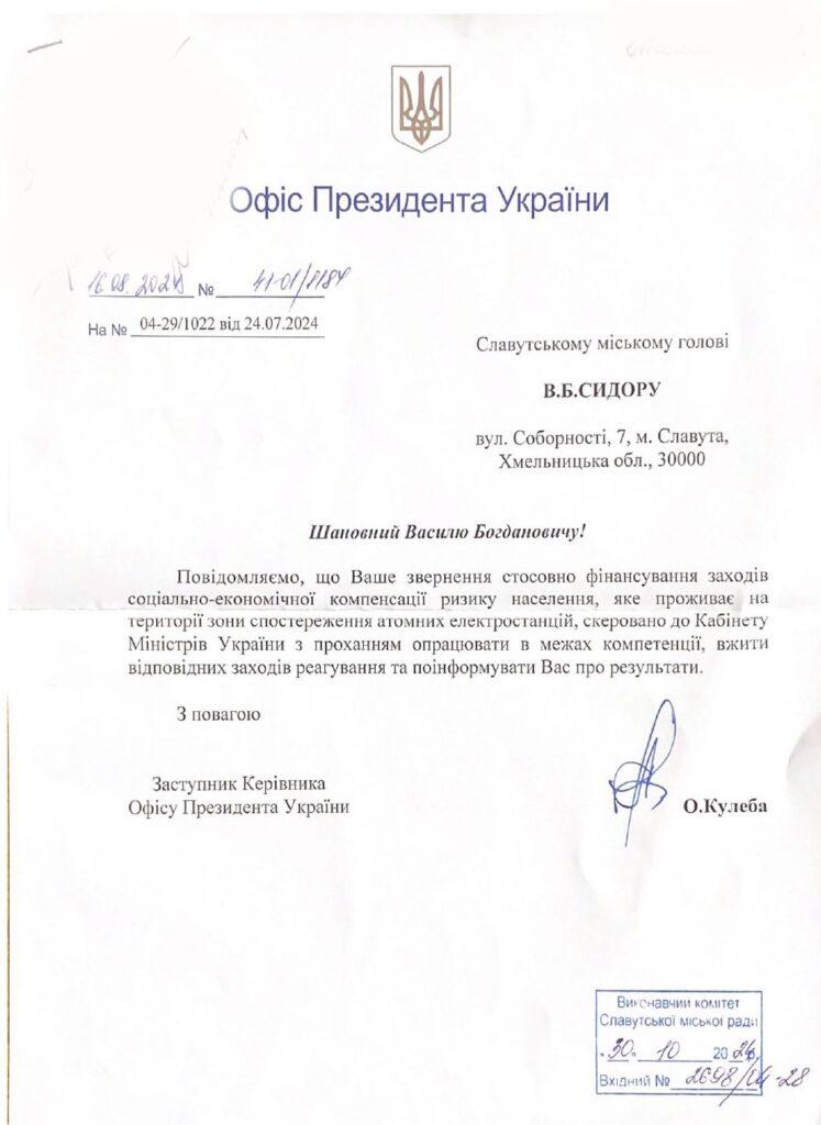 ✍Отримано відповідь з Офісу Президента України на звернення виконавчого комітету Славутської міської ради щодо фінансування заходів соціально-економічної компенсації ризику населення, яке проживає на території зони спостереження атомних електростанцій (додається).