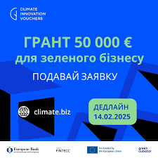 12 грудня 2024 року ГО «Грінкубатор» відкриває завершальну хвилю 2-ї фази грантової програми «Кліматичні Інноваційні Ваучери». Завдяки підтримці Європейського Банку Реконструкції та Розвитку і Європейського Союзу компанії можуть отримати грант до 50 000 євро на розробку та впровадження «зелених» технологій.  Щоб дізнатися умови участі, приєднуйтесь до онлайн-відкриття набору.