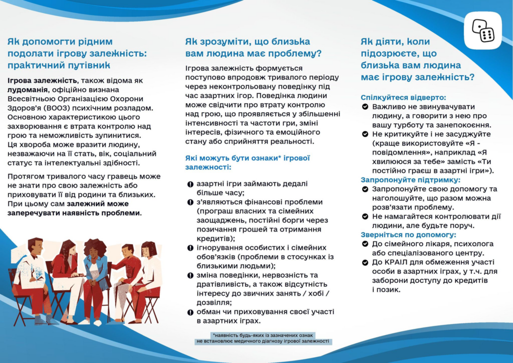 Комісія з регулювання азартних ігор та лотерей розробила практичний путівник на тему «Як допомогти рідним подолати ігрову залежність», який містить відповіді на ключові питання, зокрема: