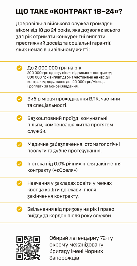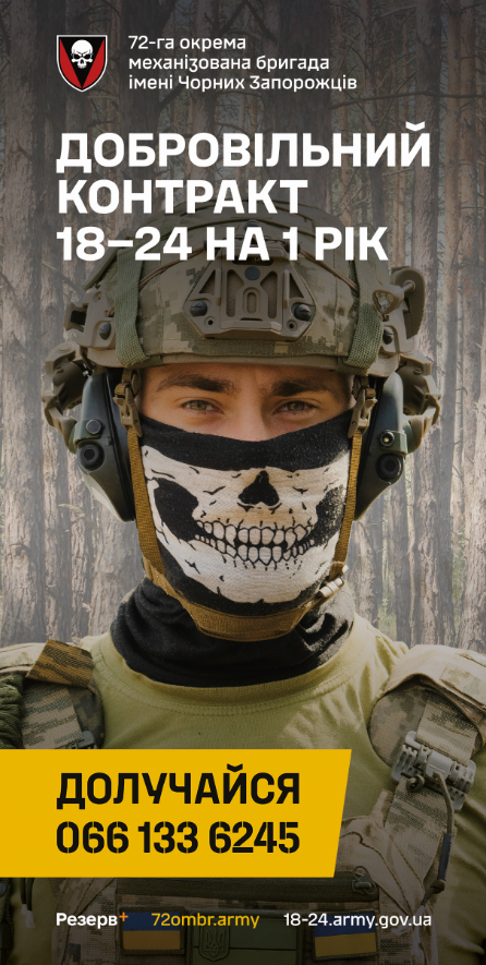 Ставай кращим із кращих! Дата 03.06.2025 Створив info-mvk Долучайся до покоління, яке вирішує вже зараз. Приєднуйся до 72 ОМБр ім. Чорних Запорожців за “Контрактом 18–24”.