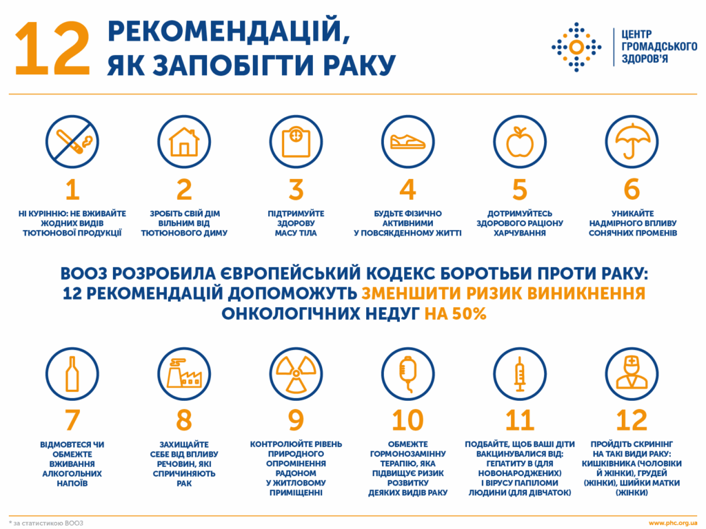 Пам’ятайте: рак — не вирок! Знизити ризик виникнення цього захворювання можна завдяки комплексу заходів, що включають первинну та вторинну профілактику. Найперша рекомендація — змініть свій спосіб життя. Адже онкологічні хвороби входять до переліку неінфекційних. А, як відомо, попередити їх виникнення можна, якщо вчасно змінити свою поведінку, спосіб життя та звички, проводити регулярні медичні огляди та скринінги.