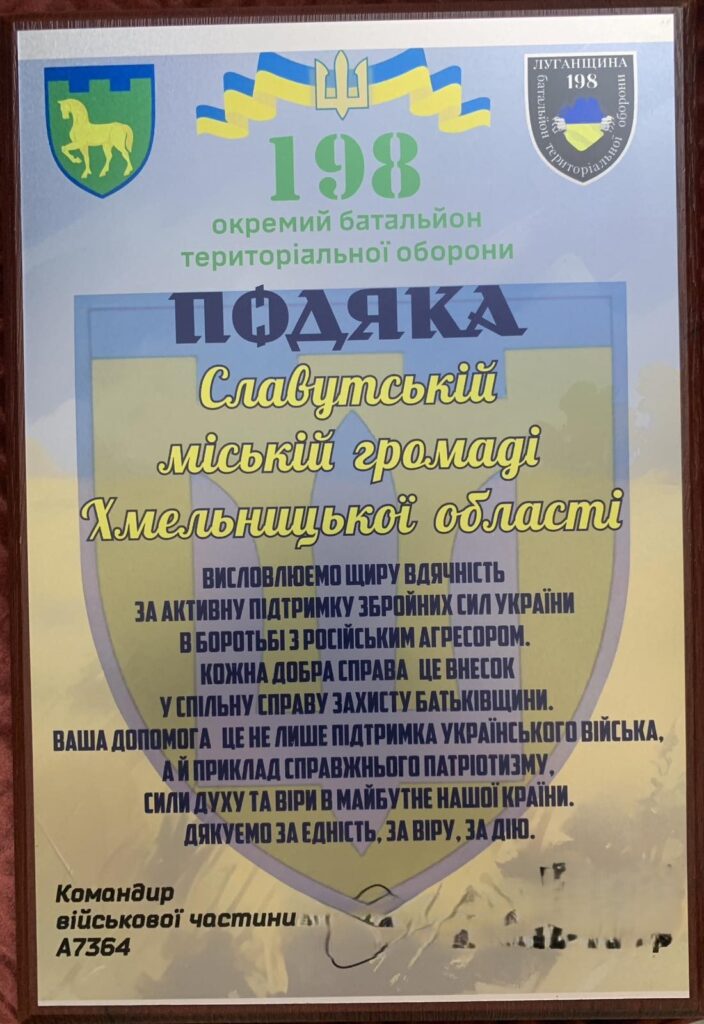 Славутська міська громада вкотре отримала подяку від Збройних Сил України. Цього разу — від 198-го окремого батальйону територіальної оборони ЗСУ, який висловив щиру вдячність за активну підтримку українських воїнів у боротьбі з російським агресором