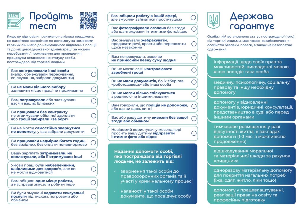 У рамках проведення інформаційної кампанії, присвяченій 30 липня — Всесвітньому дню протидії торгівлі людьми, Нацсоцслужбою спільно з експертками з протидії торгівлі людьми Юлією Саченко та Наталією Куліковою, Міграційною поліцією України, МБО «Child Rescue», Міжнародною організацією з міграції (МОМ), Громадською спілкою «Коаліція НУО з протидії торгівлі людьми», та Міністерством соціальної політики, сімʼї та єдності України як національним координатором у сфері протидії торгівлі людьми, за фінансової підтримки уряду Швеції, розроблено пам’ятку з протидії торгівлі людьми.