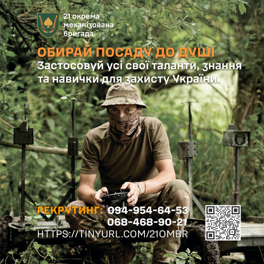 21 окрема механізована бригада шукає рішучих, мотивованих та цілеспрямованих чоловіків та жінок, які готові робити вибір вже сьогодні.