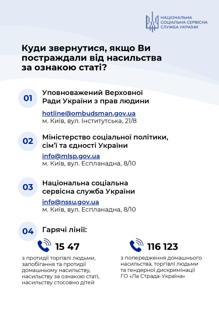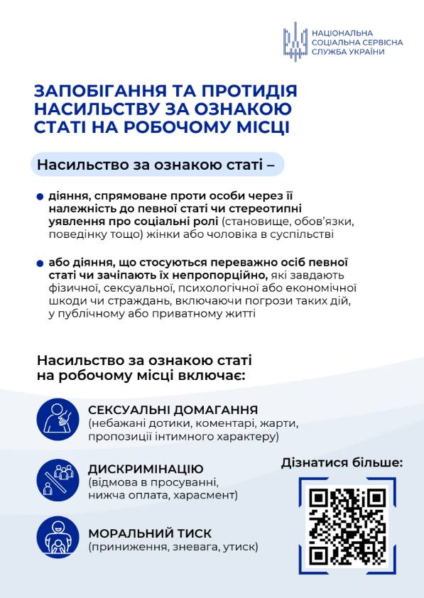 З метою підвищення обізнаності щодо існуючих механізмів запобігання насильству за ознакою статі та сприяння створенню безпечного, рівноправного й інклюзивного робочого середовища, Нацсоцслужба розробила спеціальну пам’ятку для підприємств, установ та організацій.