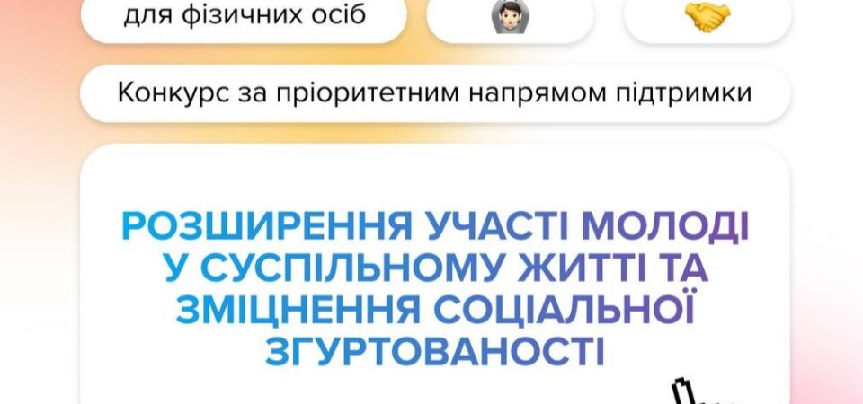 Конкурс за пріоритетним напрямом «Розширення участі молоді у суспільному житті та зміцнення соціальної згуртованості» для фізичних осіб реалізується Міністерством молоді та спорту України і Українським молодіжним фондом.