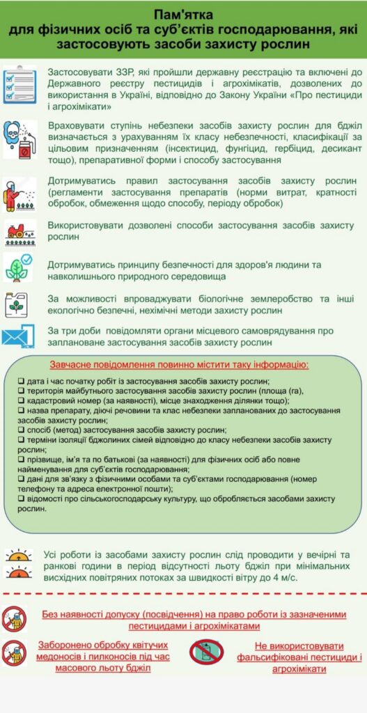 З метою попередження виникнення скарг, щодо неправомірних дій при застосуванні засобів захисту рослин на сільськогосподарських угіддях, охорони бджіл, виробництва, заготівлі та переробки безпечних продуктів бджільництва, розміщено відповідні пам’ятки👇
