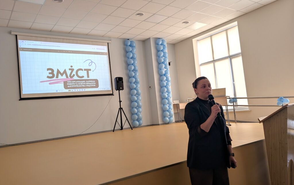 Куратор проєкту «Зміст» Олена Северенчук презентувала присутнім навчально-методичні розробки, які допоможуть отримати якісний інструментарій для організації ефективного освітнього процесу старшої школи.