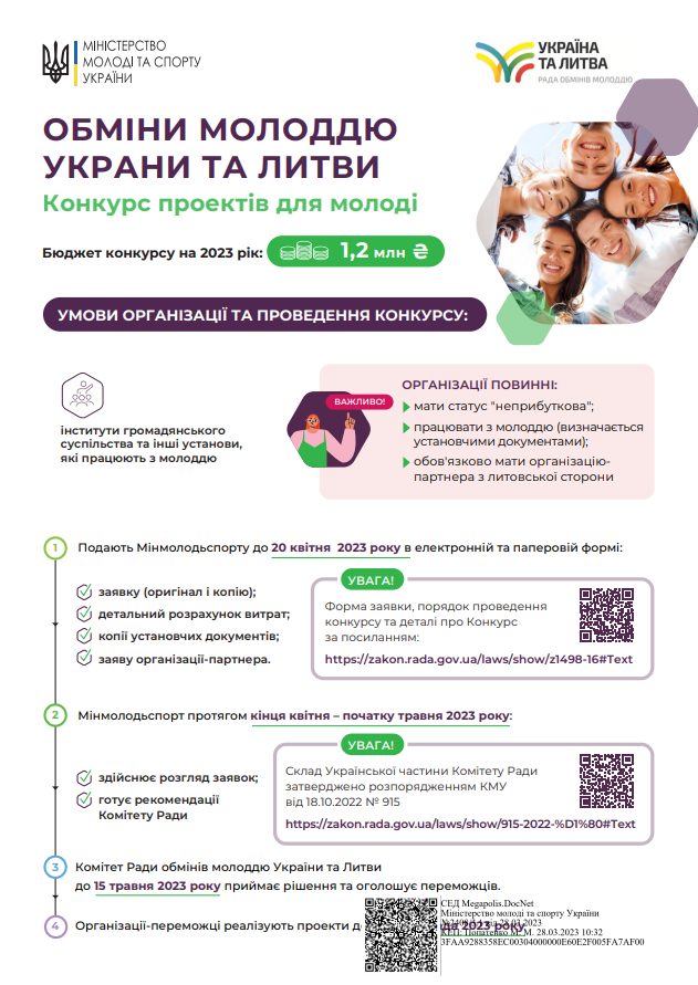 Міністерство молоді та спорту України оголосило прийом заявок на участь у конкурсі з реалізації проєктів у рамках здійснення обмінів молоддю України та Литви.